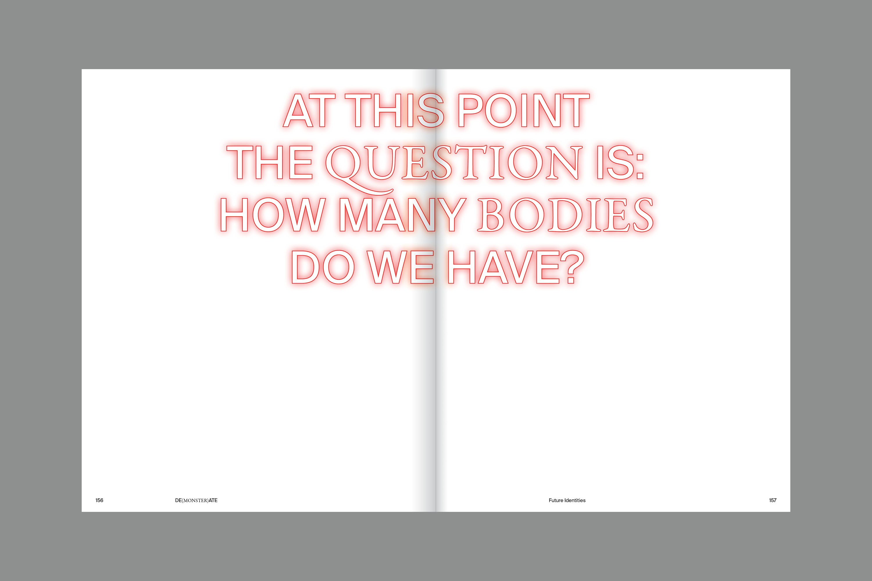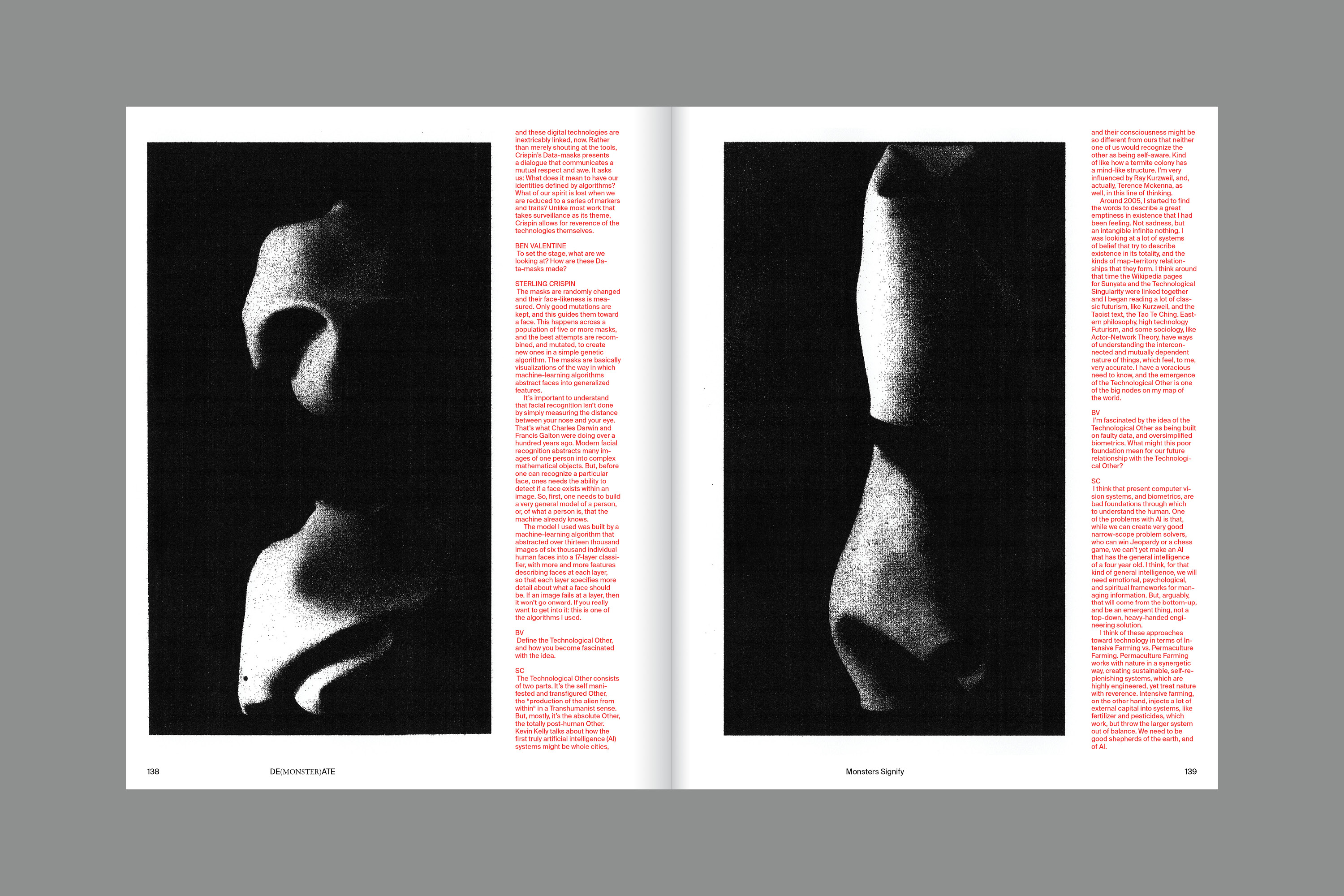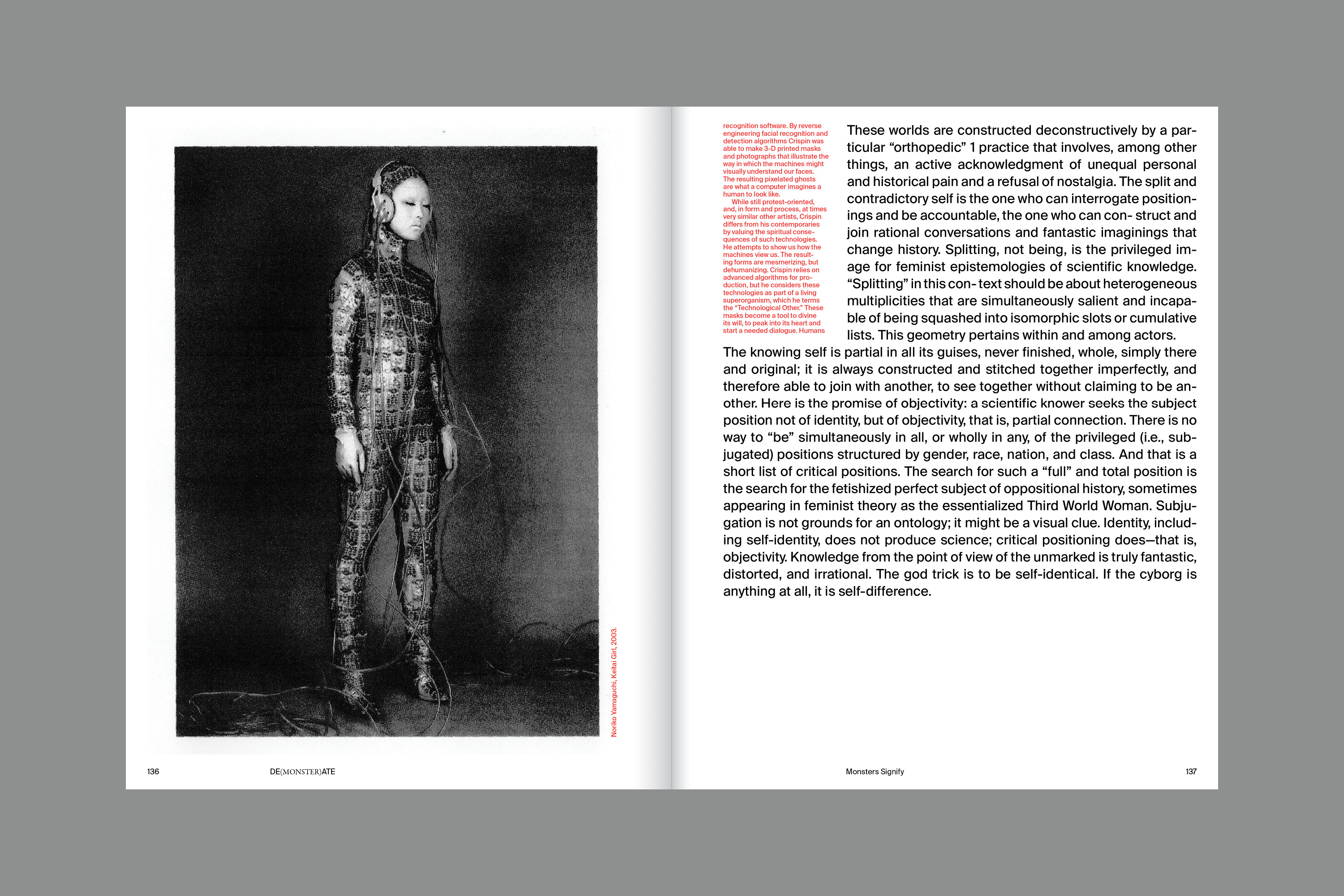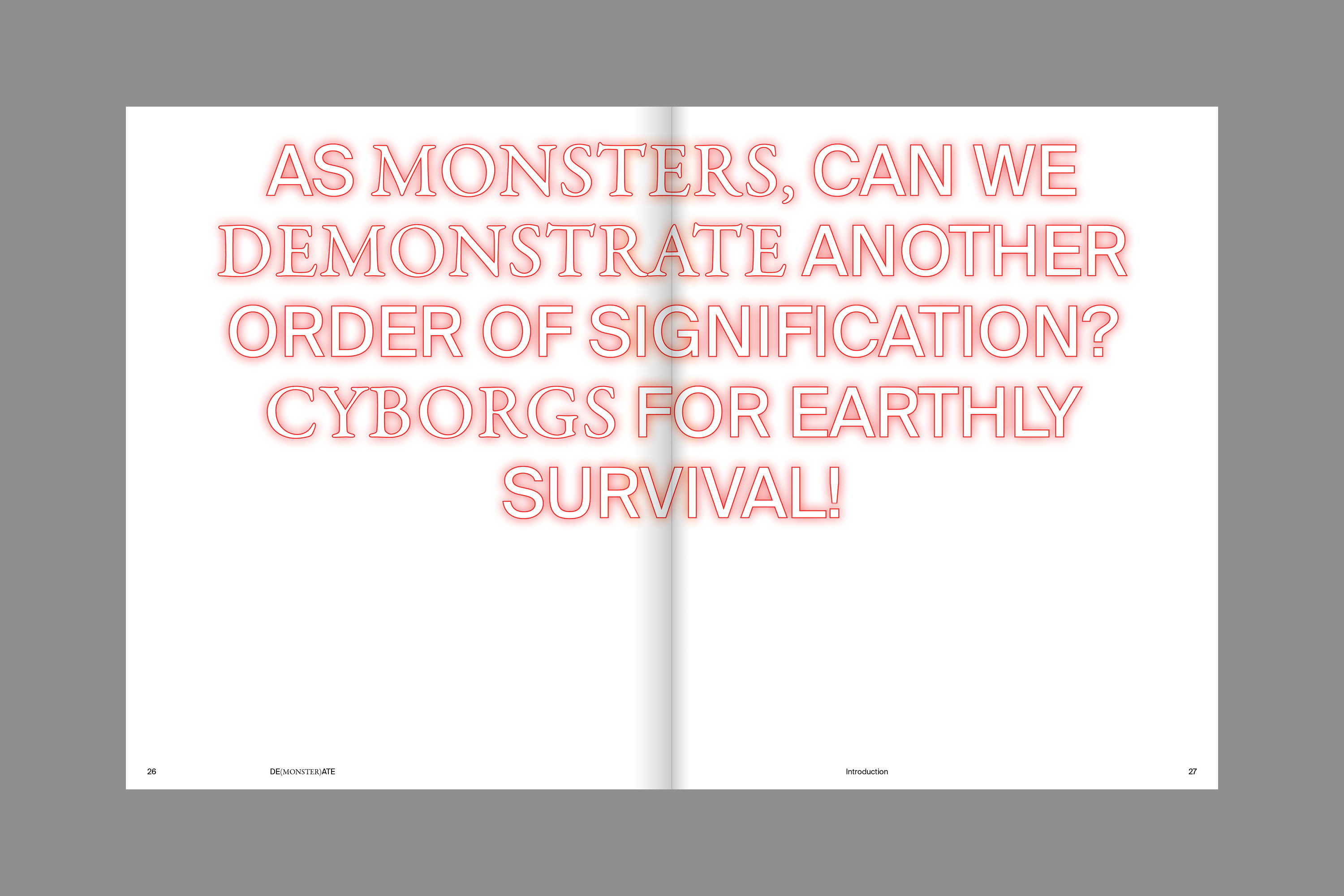 DE(MONSTER)ATE is an exploration of media theories that investigate the complex relationship of identity and technology. The narrative is rooted in Donna Haraway's quote, "These boundary creatures are, literally, monsters, a word that shares more than its root with the verb to demonstrate. Monsters signify." The book features work that forecasts the symbiotic entanglements of humans and technology.