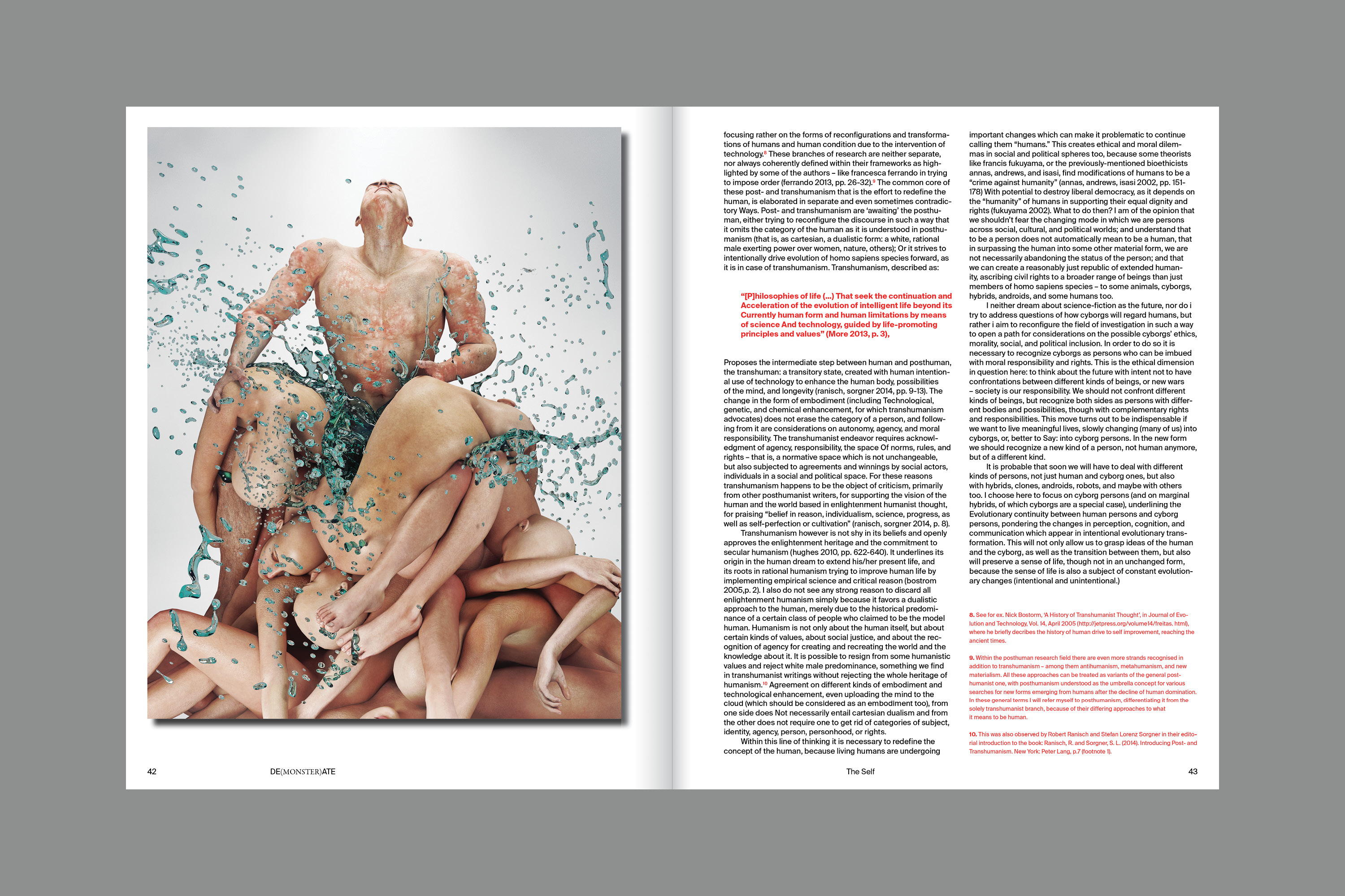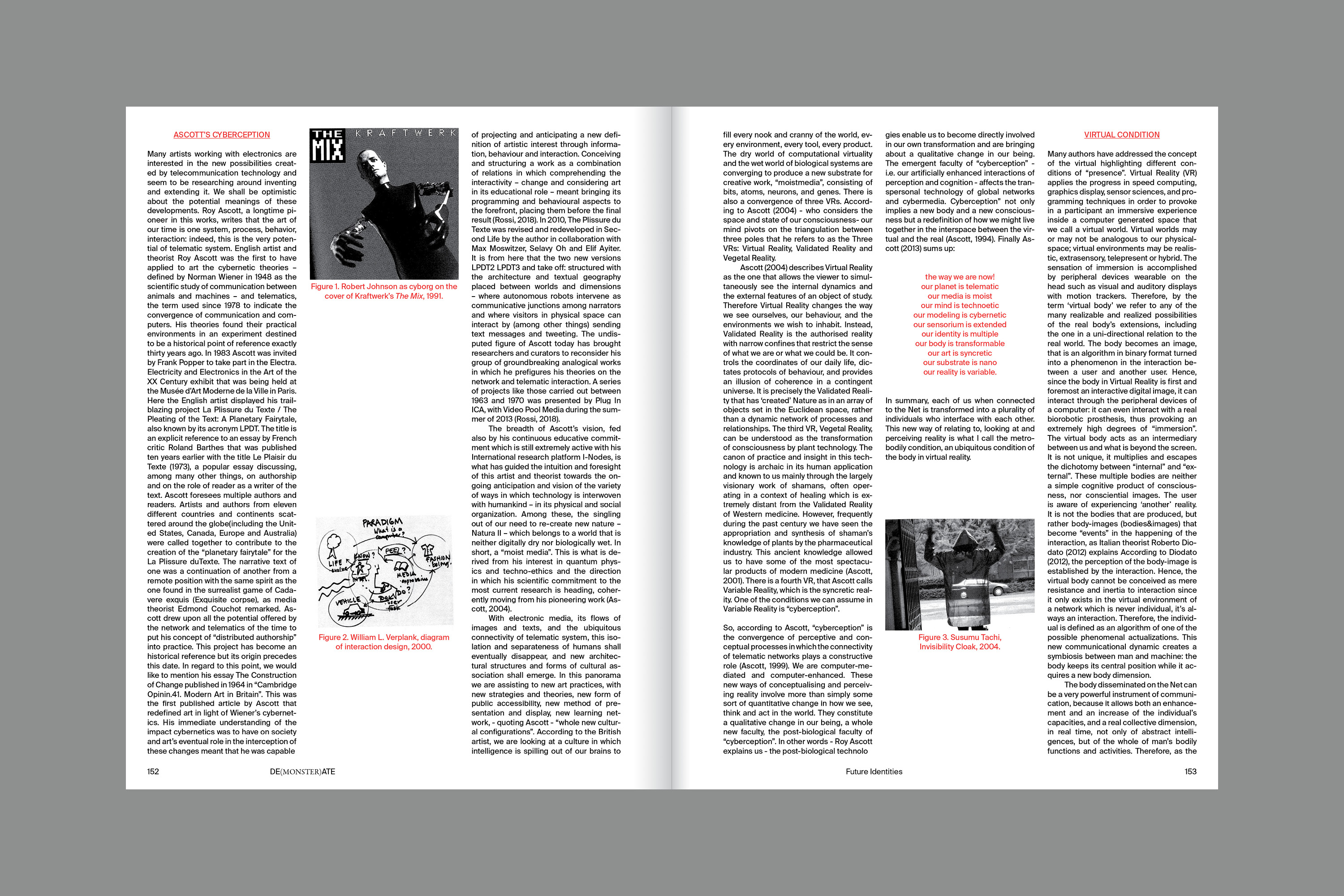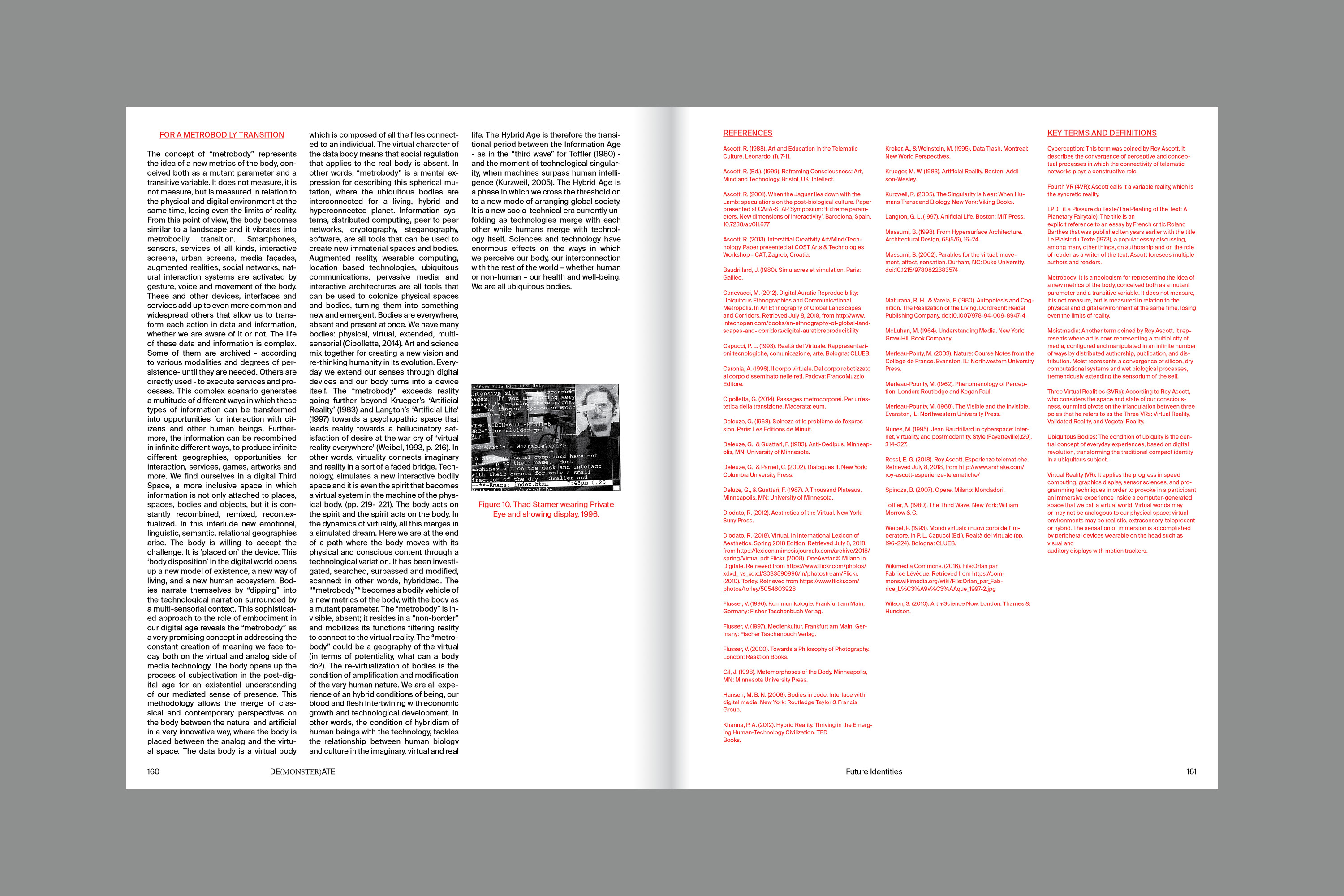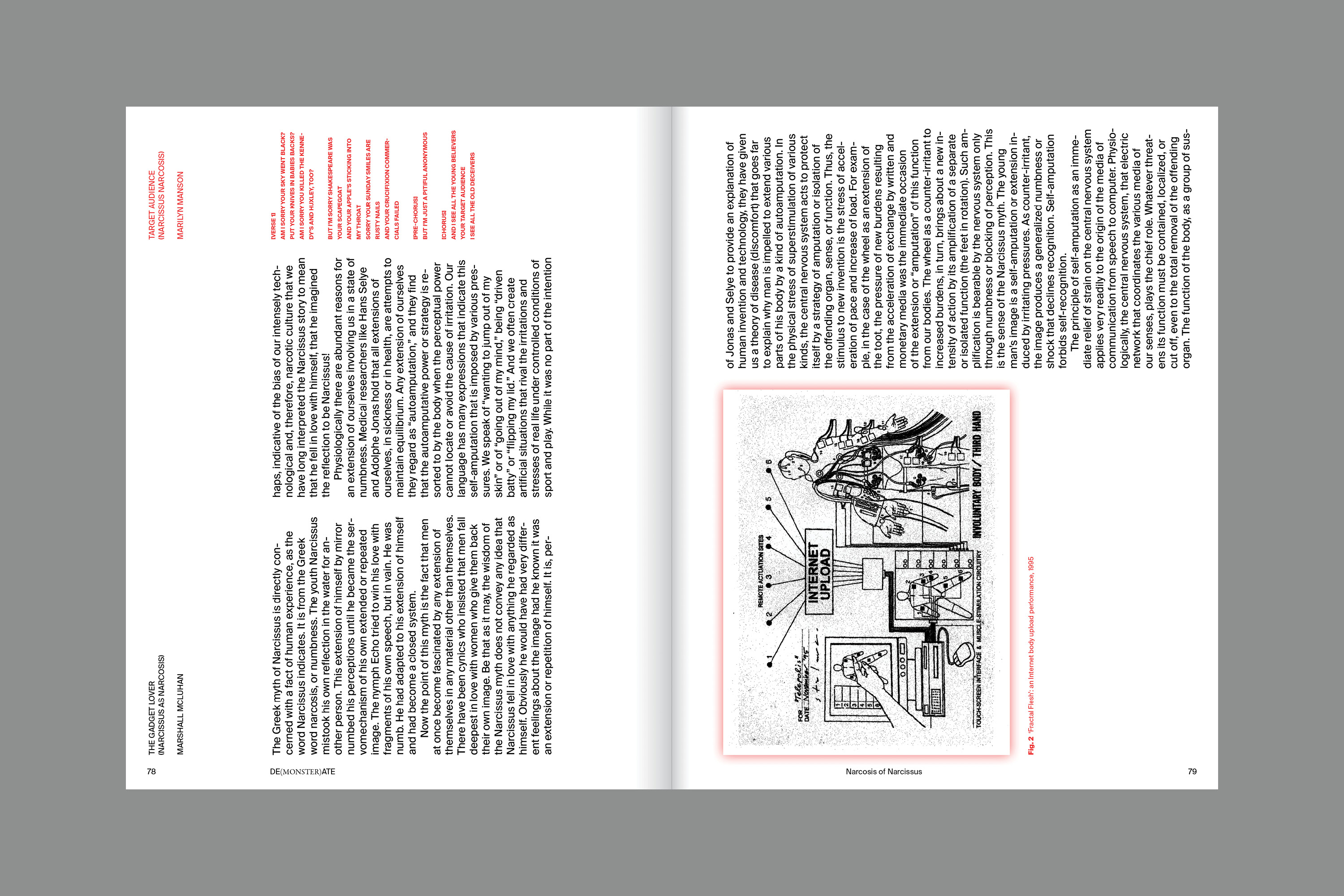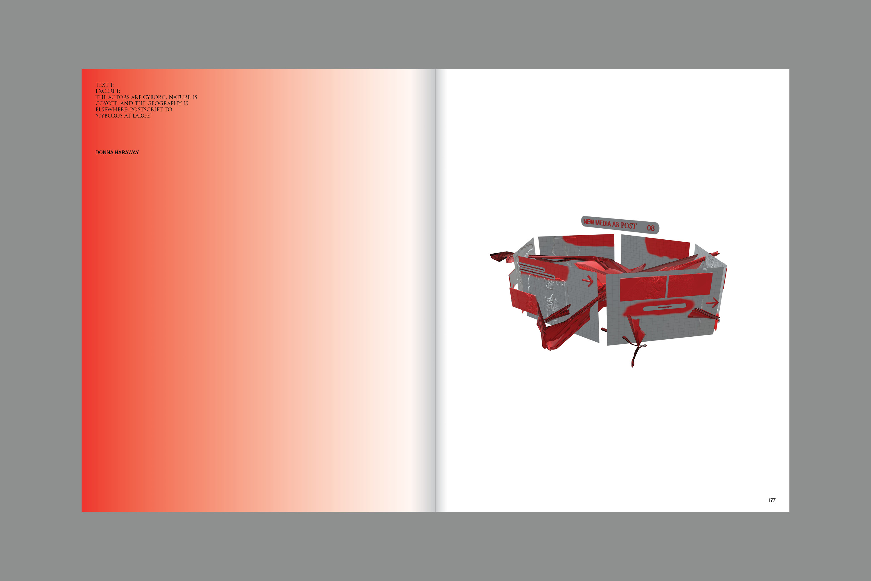 DE(MONSTER)ATE is an exploration of media theories that investigate the complex relationship of identity and technology. The narrative is rooted in Donna Haraway's quote, "These boundary creatures are, literally, monsters, a word that shares more than its root with the verb to demonstrate. Monsters signify." The book features work that forecasts the symbiotic entanglements of humans and technology.