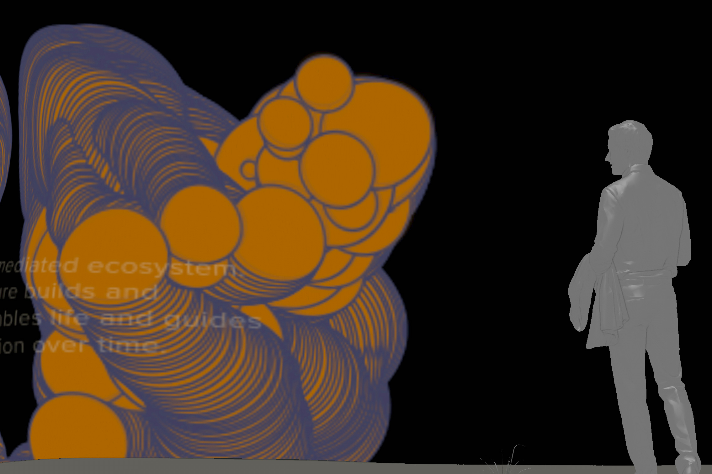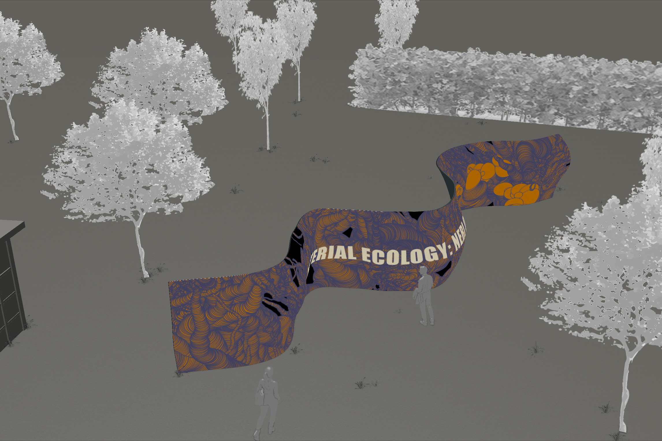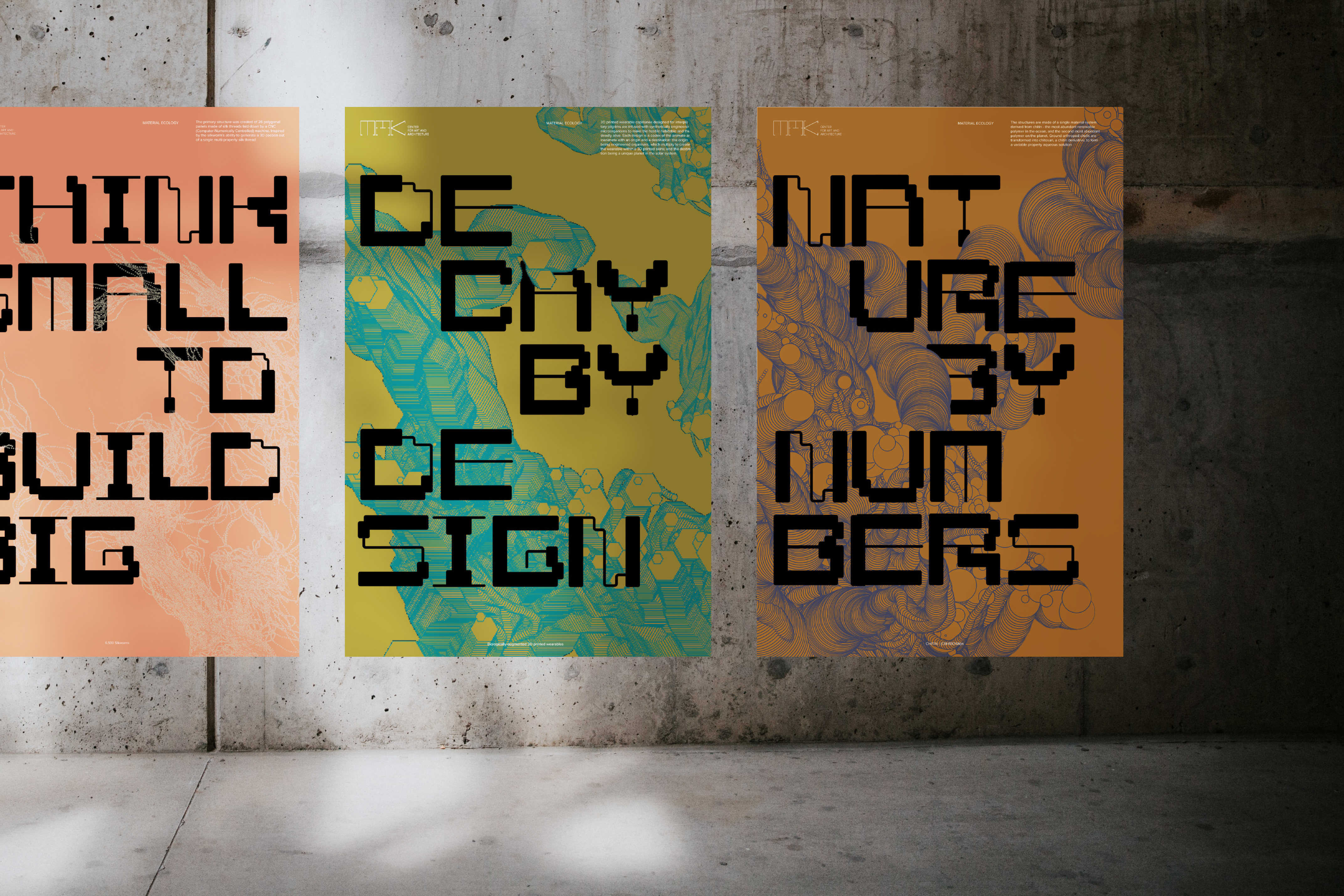 The design of the typeface is influenced by both the concept of the Schindler house through the idea of thick and thin, and by the organic structures of Neri Oxman's work. The installation is an interactive physical wall structure that represents the organic forms within nature. It threads through the Schindler house from interior to exterior breaking the threshold of the spaces and allowing visual activation through user interaction.