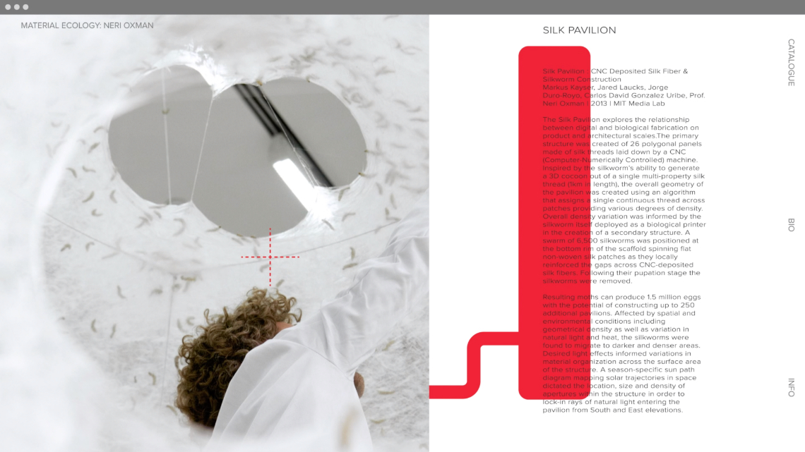 Material Ecology coined by Neri Oxman, describes techniques and objects that are informed by and directly engage with the structures, systems, and aesthetics of nature.