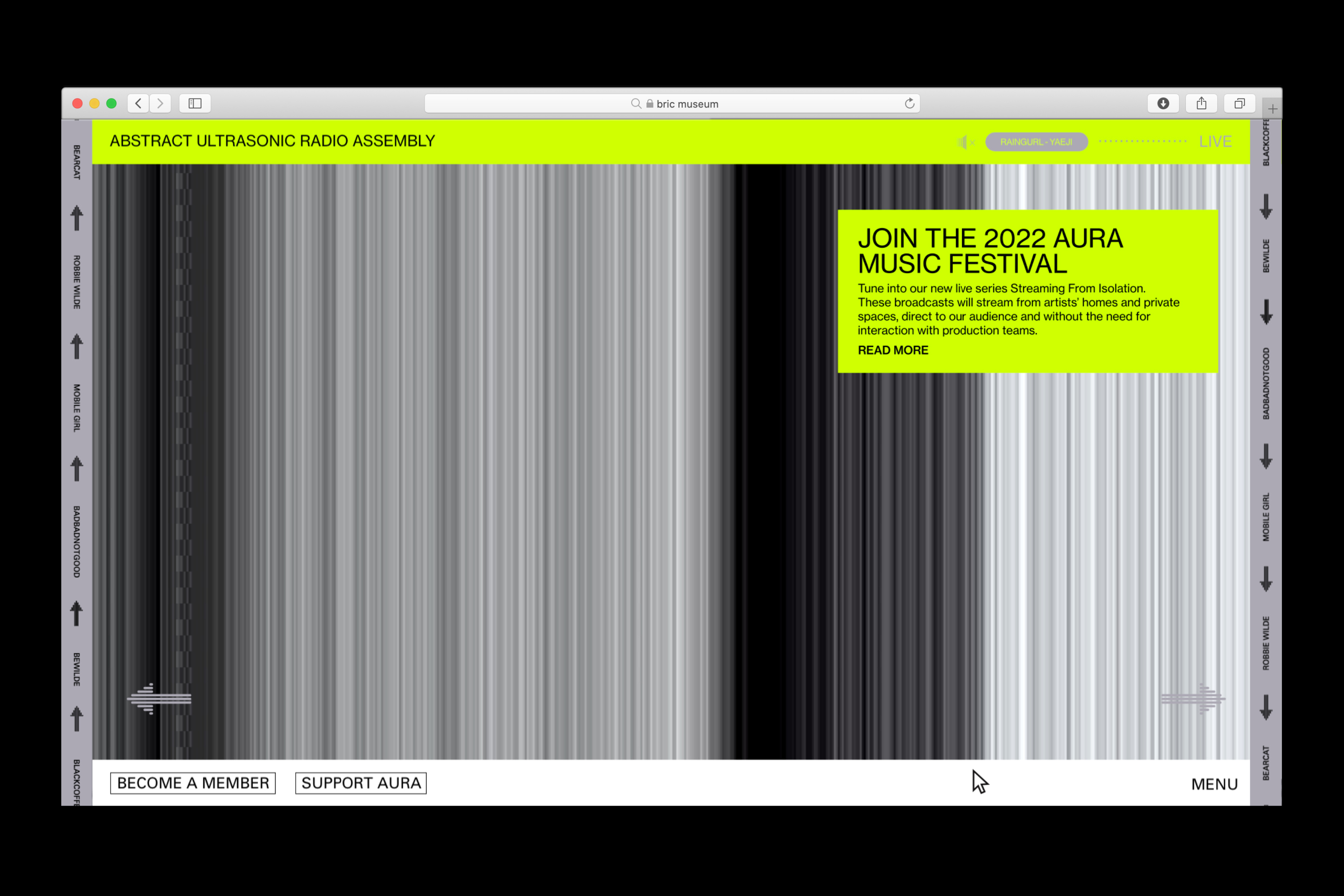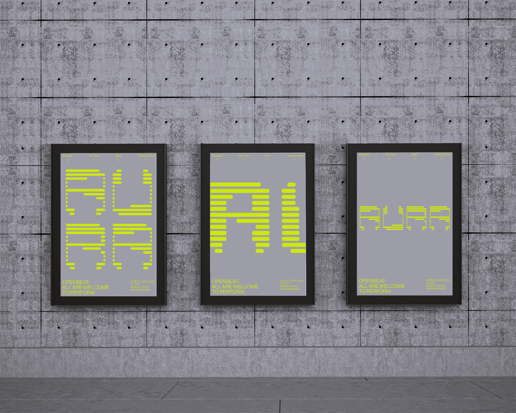 The identity of Aura was inspired by the music beatsand vibrations. The font is activated by music and generates many movements within the web, poster, app, and music festival.